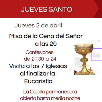 El Jueves Santo (2 de abril) se llevará a cabo la Misa de la Cena del Señor a las 20:00. Al finalizar, se realizará la tradicional visita a las siete iglesias, junto con un espacio de confesiones entre las 21:30 y las 24:00. La capilla permanecerá abierta hasta la medianoche.