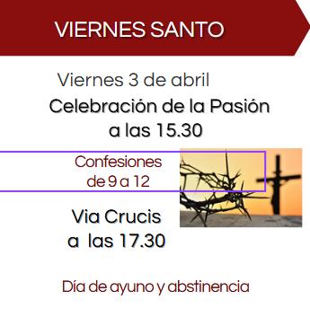 El Viernes Santo (3 de abril) se celebrará la Pasión del Señor a las 15:30. Además, habrá confesiones de 9:00 a 12:00 y el rezo del Vía Crucis a las 17:30. Se recuerda que se trata de un día de ayuno y abstinencia conforme a la práctica de la Iglesia.